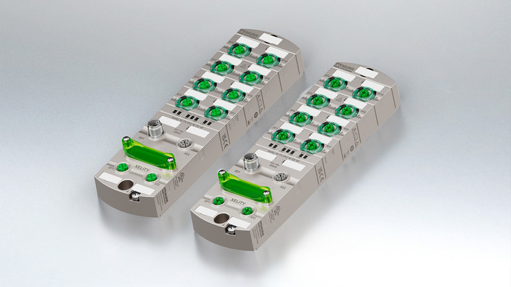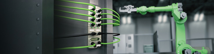 Os conectores de alimentação M12 codificados em L (4 e 5 pólos) asseguram uma fácil ligação com transferência de energia até 16 A. Como resultado do conceito de ligação à terra livre, não existem especificações para a ligação à terra.